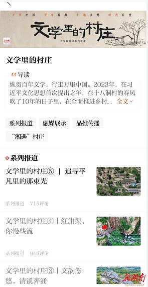 千呼萬(wàn)喚始出來(lái),4510月23日,《文學(xué)里的村莊》大型融媒體系列報(bào)道以首篇報(bào)道《穿行在魯迅的“故園”》,正式拉開(kāi)帷幕。此后,接連發(fā)布《滿城盡是紅高粱》《文韻悠悠,清溪奔涌》《紅旗渠,你慢些流》《追尋平凡里的那束光》4個(gè)篇章。