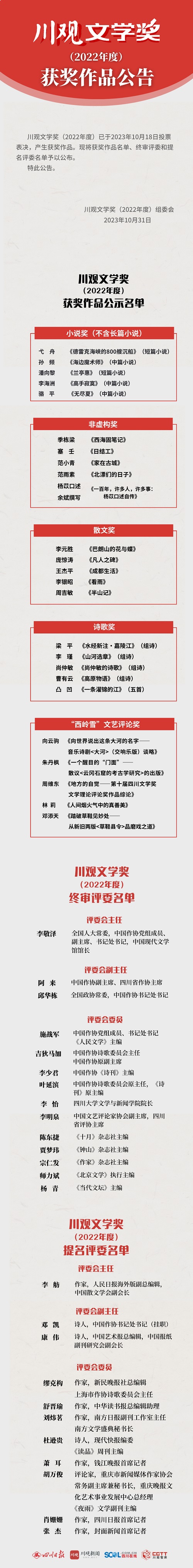 10月31日,川觀文學獎(2022年度)組委會發(fā)布公告稱,川觀文學獎(2022年度)獲獎作品已于2023年10月18日評選產(chǎn)生,并于10月27日至10月30日進行公示,共有25件作品分獲川觀文學獎(2022年度)小說獎(不含長篇小說)、非虛構(gòu)獎、詩歌獎、散文獎、“西嶺雪”文藝評論獎。據(jù)了解,2022年度川觀文學獎頒獎典禮將于今年底在成都舉行。