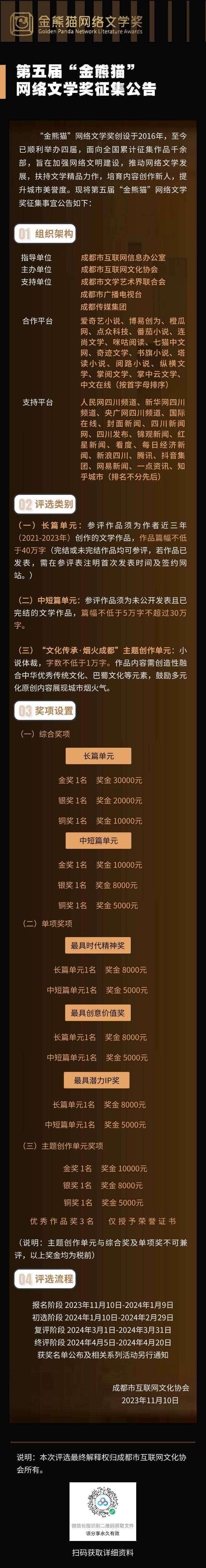 “金熊貓”網(wǎng)絡(luò)文學(xué)獎(jiǎng)創(chuàng)設(shè)于2016年,至今已順利舉辦四屆,面向全國累計(jì)征集作品千余部,旨在加強(qiáng)網(wǎng)絡(luò)文明建設(shè),推動(dòng)網(wǎng)絡(luò)文學(xué)發(fā)展,扶持文學(xué)精品力作,培育內(nèi)容創(chuàng)作新人,提升城市美譽(yù)度?,F(xiàn)將第五屆“金熊貓”網(wǎng)絡(luò)文學(xué)獎(jiǎng)?wù)骷乱斯嫒缦拢?/p>