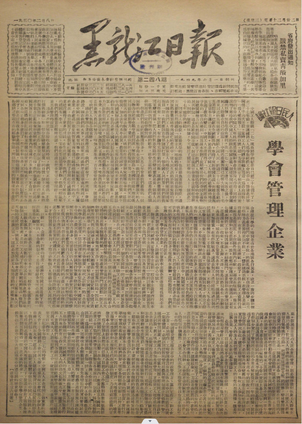 利用這些簡陋殘缺的設備,他們抓緊開展了印刷廠修復工作。同時跑省工委、省人民政府、省軍區(qū)采寫新聞,并用僅有的一臺收音機抄收延安新華廣播電臺的新聞……12月1日,中共黑龍江省工委機關報創(chuàng)刊了。這一天,該報社的社牌也正式掛出。