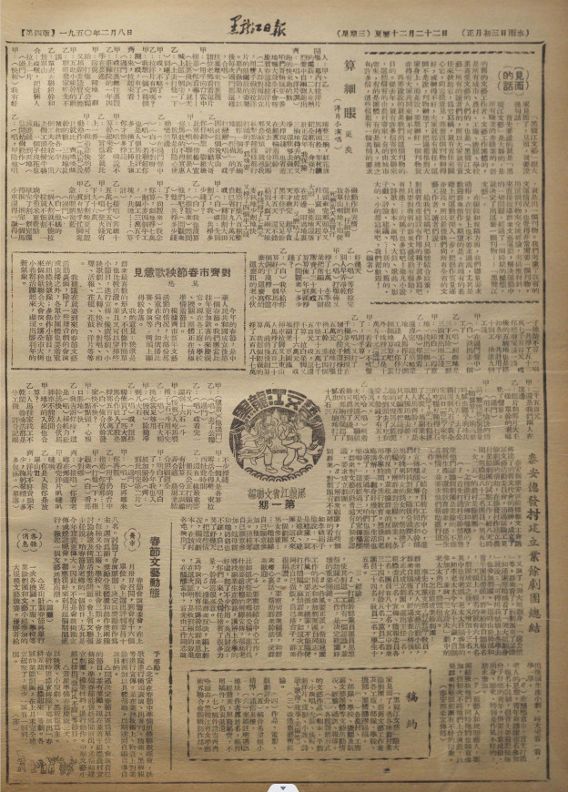 《松江日報》創(chuàng)辦初期,第4版為綜合性副刊,刊載配合中心工作、表現群眾生活的故事、秧歌劇、鼓詞及常識等,所發(fā)稿均經編輯作通俗化編寫。如前5期,配合農村民主建政工作,發(fā)表了《夫妻拜年》(小型秧歌?。?、《李春和他妹子》(記建政中一個紅白榜的故事)、《唱給姐妹聽》等。從1949年11月下旬起,該報陸續(xù)策劃、發(fā)表文藝作品的園地《松江文藝》(松江省文聯籌委會編)等專頁。專頁篇幅多為1/2版,刊發(fā)過《我們要殺敵上戰(zhàn)場》《打狼》《兩個朝鮮姑娘》《漁夫恨》等文藝作品。