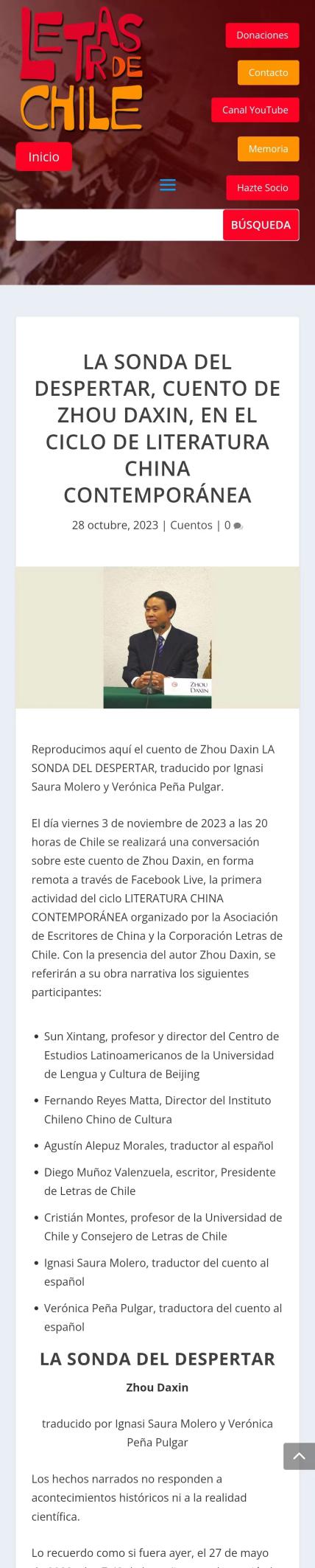《首次喚醒》是周大新今年3月新發(fā)表的作品,經(jīng)智利“中國文學(xué)讀者俱樂部”推薦,由智利文學(xué)網(wǎng)(Letras de Chile)組織翻譯并于今年10月全文刊發(fā),一經(jīng)發(fā)布就引起了智利讀者的廣泛興趣。