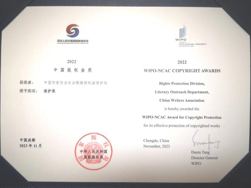 11月23日,第九屆中國國際版權博覽會暨2023國際版權論壇在成都舉辦。論壇上舉辦了2022中國版權金獎頒獎儀式。其中,中國作家協會社會聯絡部權益保護處等5家單位、部門榮獲保護獎。中宣部副部長張建春、世界知識產權組織副總干事西爾維·福爾班為獲獎者頒獎。