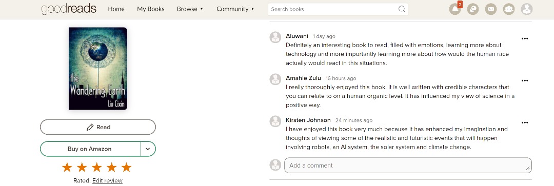 主修化學的阿魯瓦妮(Aluwani)、主修教育的阿瑪樂(Amahle)和主修藝術(shù)的克爾斯?。↘irsten)也各抒己見,紛紛表達了各自對這部世界級科幻佳作的喜愛。大家還在goodreads上積極留言,發(fā)表了對本書的積極評價。該網(wǎng)站目前擁有超過22億條書籍條目和7700萬篇書評,是英文世界影響力最大的網(wǎng)絡(luò)書評平臺之一。參加讀書會的同學們還表示,將邀請自己的親人朋友一起閱讀《流浪地球》,領(lǐng)略中國科幻作品的獨特魅力。