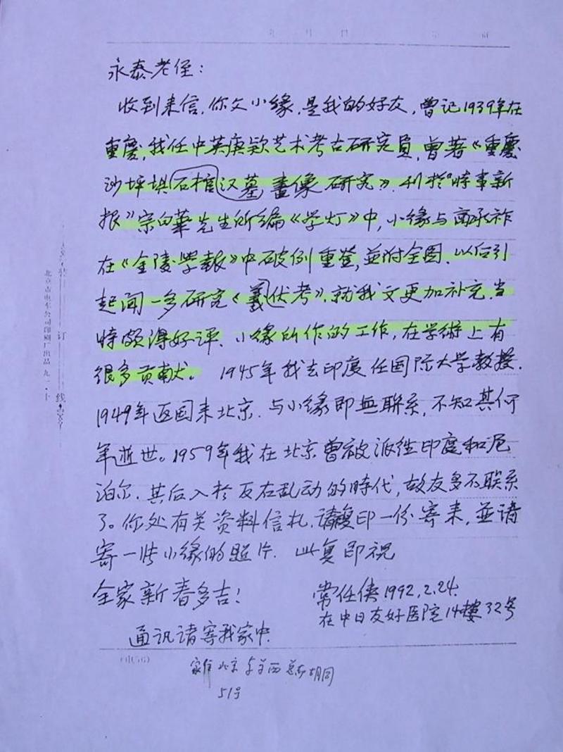 收到來信,你父小緣,是我的好友。曾記1939年在重慶,我任中英庚款藝術(shù)考古研究員,曾著《重慶沙坪壩漢墓石棺畫像研究》,刊于《時事新報》宗白華先生所編《學(xué)燈》中,小緣與商承祚在《金陵學(xué)報》中破例重登,并附全圖,以后引起聞一多研究《伏羲考》,就我文更加補充,當(dāng)時頗得好評。小緣所作的工作,在學(xué)術(shù)上有很多貢獻(xiàn)。1945年我去印度,任國際大學(xué)教授,1949年返國來北京,與小緣即無聯(lián)系,不知其何年逝世。1959年我在北京曾被派往印度和尼泊爾,其后入于反右動亂的時代,故友多不聯(lián)系了。你處有關(guān)資料信札,請復(fù)印一份寄來,并請寄一張小緣的照片。此復(fù),即祝