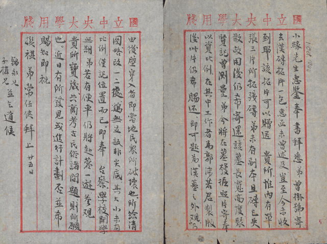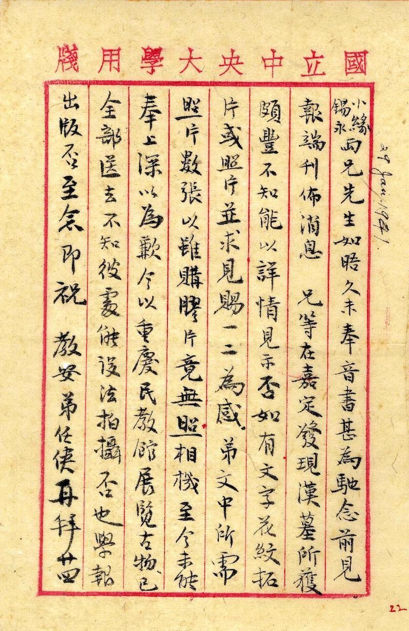 久未奉音書,甚為馳念。前見報端刊布消息,兄等在嘉定發(fā)現(xiàn)漢墓,所獲頗豐,不知能以詳情見示否?如有文字、花紋、拓片或照片,并求見賜一二為感。弟文中所需照片數(shù)張,以雖購膠片,竟無照相機(jī),至今未能奉上,深以為歉。今以重慶民教館展覽古物已全部送去,不知彼處能設(shè)法拍攝否也?學(xué)報出版否?至念。即祝