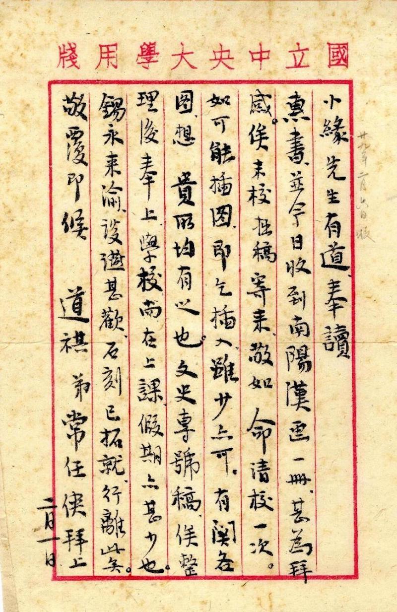 奉讀惠書,并今日收到南陽漢畫一冊,甚為拜感。俟末校拙稿寄來,敬如命清校一次。如可能插圖即乞插入,雖少亦可。有關(guān)各圖,想貴所均有之也。文史專號稿,俟整理后奉上,學(xué)校尚在上課,假期亦甚少也。錫永來渝,設(shè)宴甚歡,石刻已拓就,行離此矣。敬復(fù),即候