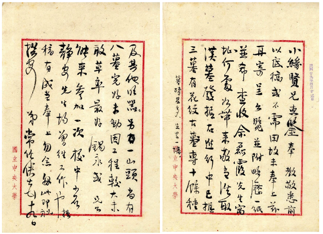 2022年12月,南京大學(xué)為慶祝建校120周年,舉辦了“百廿風(fēng)華 南雍手澤——南京大學(xué)藏近現(xiàn)代名人書畫手跡展”,在該展覽上筆者見到了南京大學(xué)圖書館所藏常任俠上信原件,如下圖(照片已經(jīng)南京大學(xué)圖書館授權(quán)使用)所示: