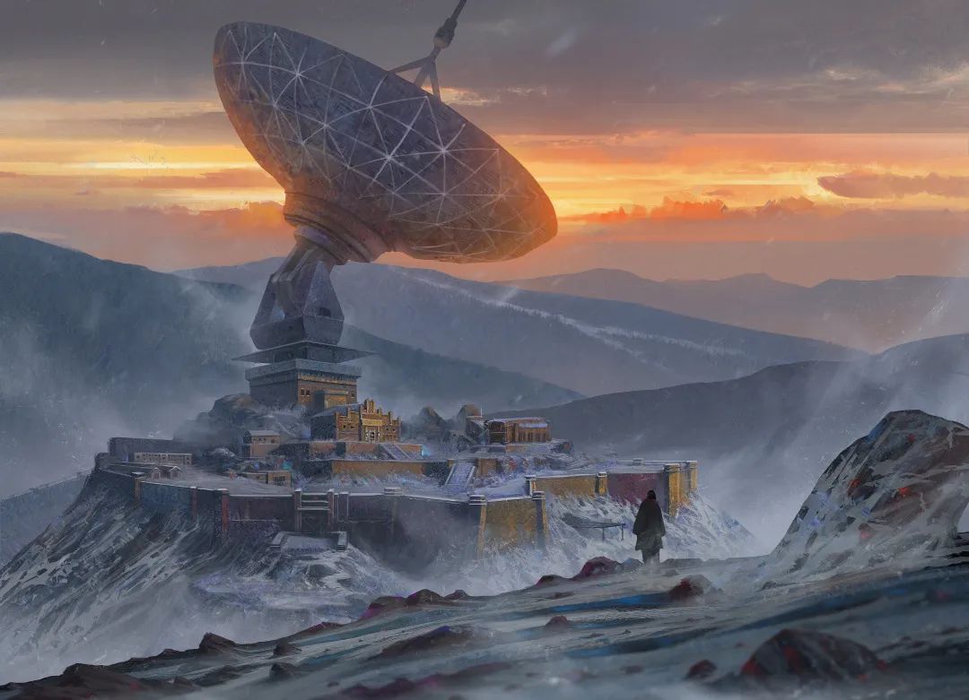 圖為具有中國(guó)審美意蘊(yùn)的科幻插圖,①③為著名科幻插畫師趙恩哲所繪制的《紅岸基地日落》《云嵐山》;②為青年科幻插畫師繪制的《三日凌空》
