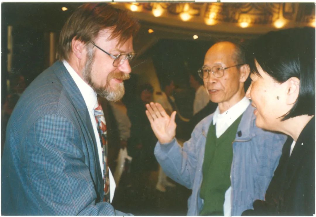 1996年4月,賈芝(中)在主持國際民間敘事研究會北京學(xué)術(shù)研討會期間,與國際民間敘事研究會主席雷蒙德(左一)交談,右一為金茂年