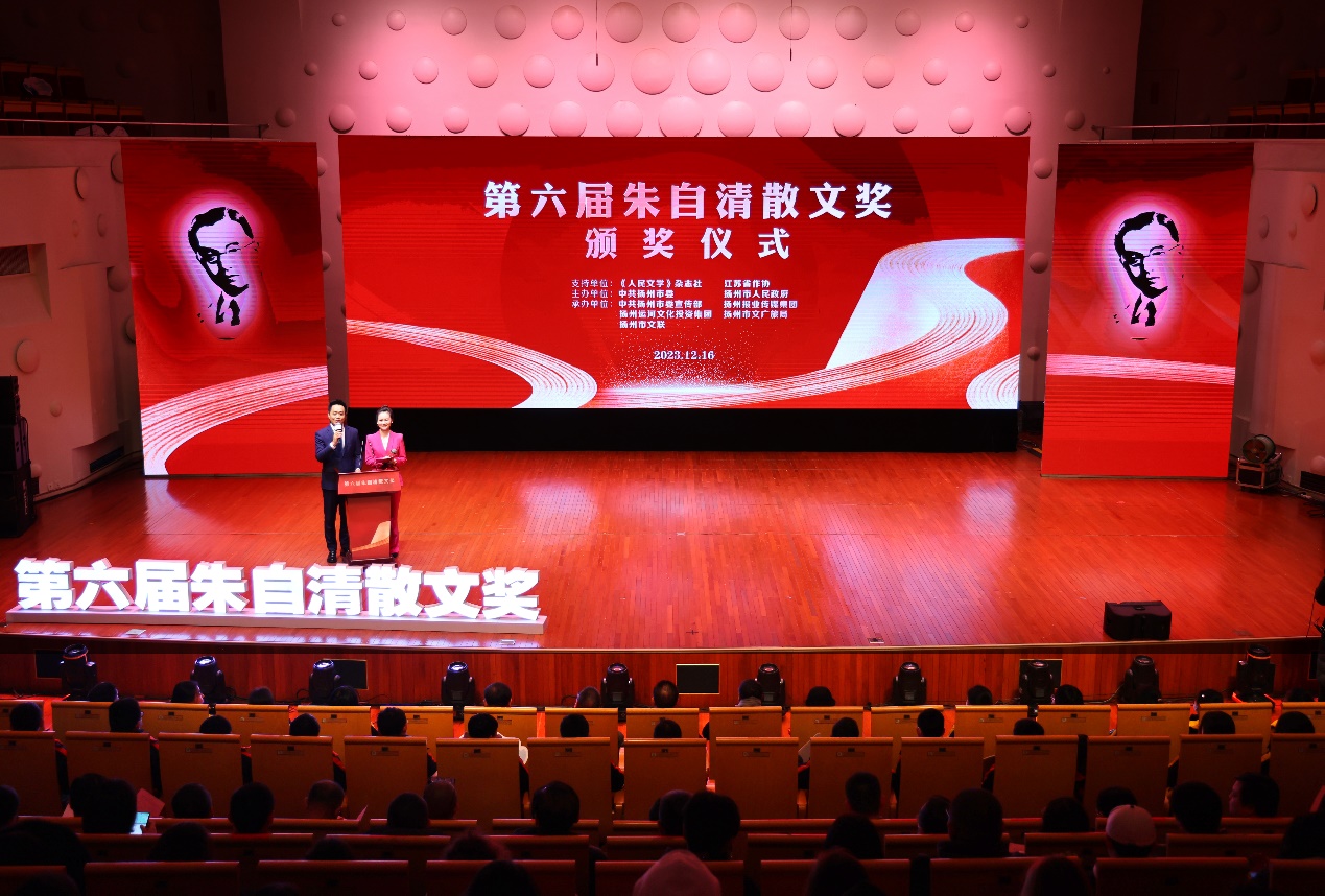 12月16日,第六屆“朱自清散文獎(jiǎng)”頒獎(jiǎng)儀式在揚(yáng)州市音樂(lè)廳舉行。本屆“朱自清散文獎(jiǎng)”由《人民文學(xué)》雜志社、江蘇省作協(xié)學(xué)術(shù)支持,中共揚(yáng)州市委、揚(yáng)州市人民政府主辦,中共揚(yáng)州市委宣傳部、揚(yáng)州報(bào)業(yè)傳媒集團(tuán)、揚(yáng)州運(yùn)河文化投資集團(tuán)、揚(yáng)州市文廣旅局、揚(yáng)州市文聯(lián)共同承辦。