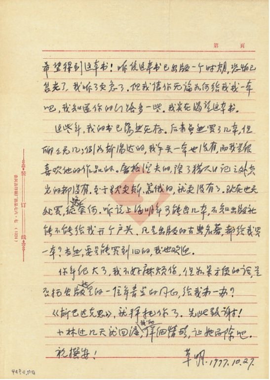 你年紀(jì)大了,我不好麻煩你,但如果方便的話,是否托出版社里的一位年青點(diǎn)的同志,給我辦一辦?