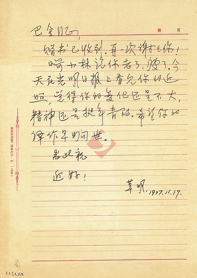 中國現(xiàn)代文學(xué)館的書信庫中珍藏著草明致巴金書信兩封,它們分別寫于1977年10月27日和1977年11月17日。從書信時(shí)間、內(nèi)容來看,顯然是草明寫給巴金的具有連續(xù)性的兩封書信,且兩封書信之間有巴金的回信一封。
