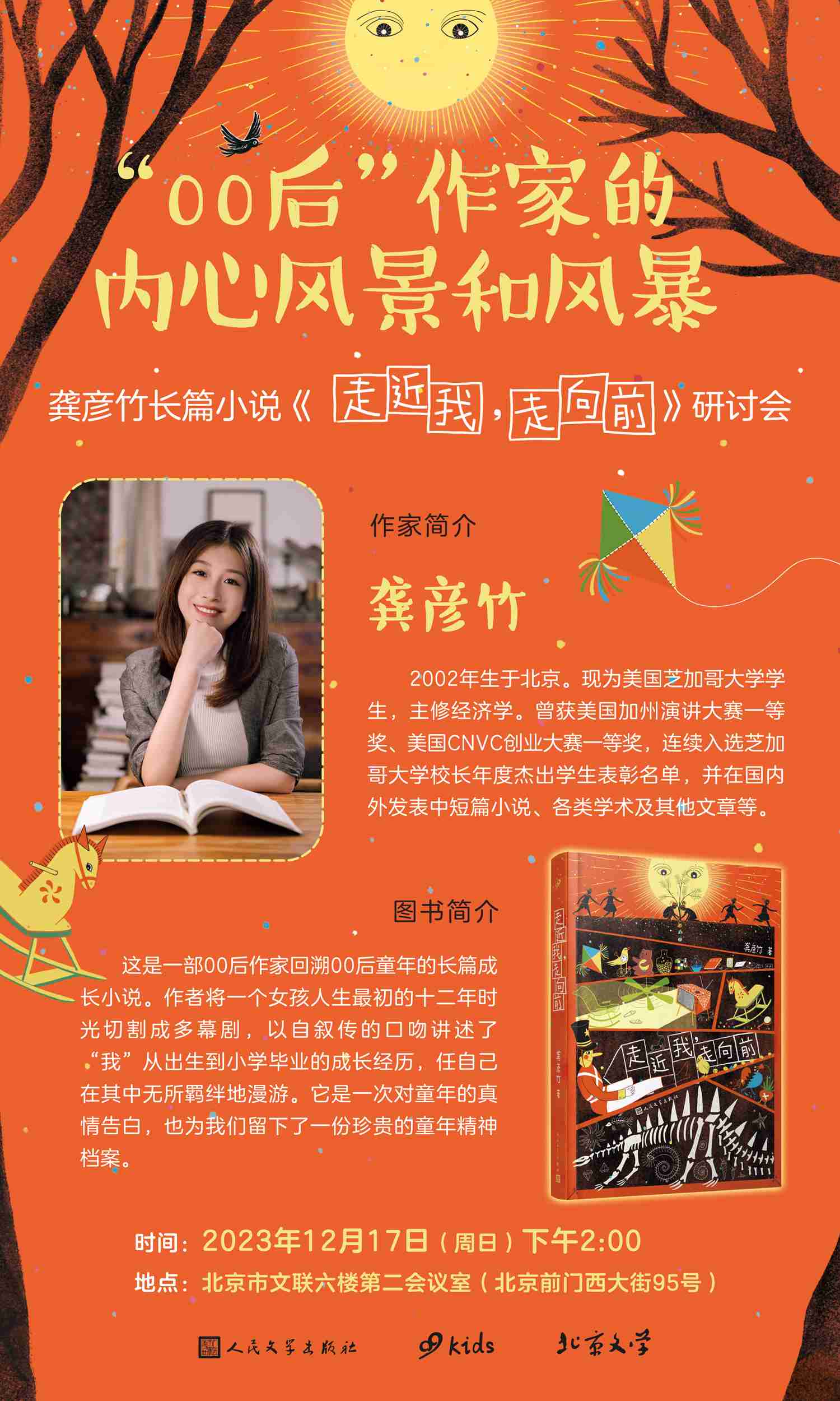 龔彥竹2002年生于北京,現(xiàn)為美國芝加哥大學學生,主修經(jīng)濟學。《走近我,走向前》是她17歲時為最大程度地真實記錄童年而創(chuàng)作的一部長篇成長小說,堪稱一份珍貴的童年精神檔案。該書自10月出版以來廣受好評,已入選《文學報》童書好書榜、《中國新聞出版廣電報》優(yōu)秀暢銷書排行榜、探照燈好書榜等多個權威榜單。