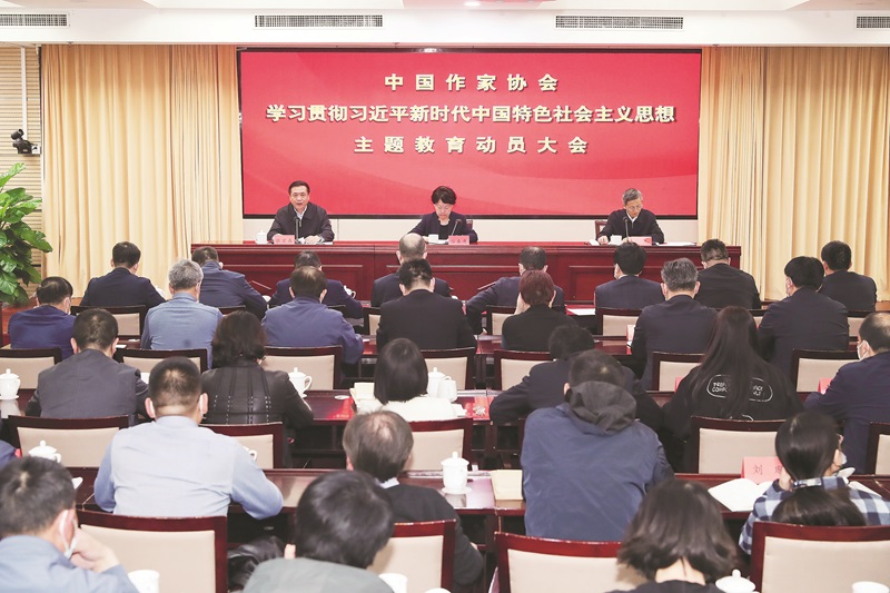 2023年,中國(guó)作協(xié)扎實(shí)開(kāi)展學(xué)習(xí)貫徹習(xí)近平新時(shí)代中國(guó)特色社會(huì)主義思想主題教育,用黨的創(chuàng)新理論統(tǒng)一思想行動(dòng),持續(xù)深化以學(xué)鑄魂、以學(xué)增智、以學(xué)正風(fēng)、以學(xué)促干。及時(shí)跟進(jìn)學(xué)習(xí)習(xí)近平總書(shū)記重要講話和指示批示精神,特別是黨中央召開(kāi)文化傳承發(fā)展座談會(huì)、全國(guó)宣傳思想文化工作會(huì)議之后,以強(qiáng)烈的責(zé)任感推進(jìn)學(xué)習(xí)貫徹習(xí)近平文化思想,向文學(xué)界發(fā)出有力號(hào)召,推動(dòng)黨的創(chuàng)新理論在中國(guó)文學(xué)的廣袤大地上生根發(fā)芽,引領(lǐng)文學(xué)界主動(dòng)承擔(dān)起新時(shí)代新的文化使命。中國(guó)作協(xié)聚焦文化強(qiáng)國(guó)建設(shè)目標(biāo)任務(wù)及宣傳思想文化工作面臨的挑戰(zhàn)難題,成立8個(gè)調(diào)研組,撲下身子、沉到一線、掌握實(shí)情,研究新情況,解決新問(wèn)題,為推進(jìn)新時(shí)代文學(xué)高質(zhì)量發(fā)展夯實(shí)基礎(chǔ)。圖為4月11日中國(guó)作協(xié)學(xué)習(xí)貫徹習(xí)近平新時(shí)代中國(guó)特色社會(huì)主義思想主題教育動(dòng)員大會(huì)現(xiàn)場(chǎng)。