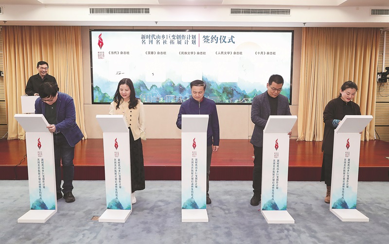 中國(guó)作協(xié)實(shí)施“新時(shí)代山鄉(xiāng)巨變創(chuàng)作計(jì)劃”以來(lái),引領(lǐng)廣大作家以強(qiáng)烈的歷史主動(dòng)精神深入生活、扎根人民,熱忱描繪新時(shí)代新征程的恢宏氣象,書(shū)寫(xiě)生生不息的人民史詩(shī)。2023年,中國(guó)作協(xié)兩次召開(kāi)工作推進(jìn)會(huì),組織作品改稿班,建立“新時(shí)代山鄉(xiāng)巨變創(chuàng)作計(jì)劃”年會(huì)制度,拓展優(yōu)秀選題創(chuàng)作出版渠道,增強(qiáng)社會(huì)傳播力和影響力。圖為2月23日在北京舉行的“新時(shí)代山鄉(xiāng)巨變創(chuàng)作計(jì)劃”名刊名社拓展計(jì)劃啟動(dòng)暨簽約儀式現(xiàn)場(chǎng)。