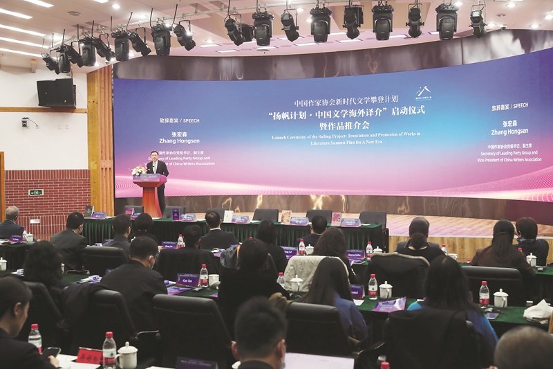 中國(guó)作協(xié)實(shí)施“新時(shí)代文學(xué)攀登計(jì)劃”以來(lái),凝聚優(yōu)秀的作家、出版社、文學(xué)期刊等優(yōu)質(zhì)文學(xué)資源,對(duì)文學(xué)創(chuàng)作、編輯、出版、傳播、轉(zhuǎn)化全流程統(tǒng)籌協(xié)調(diào),積極搭建平臺(tái),形成聯(lián)動(dòng)機(jī)制,共同打造中國(guó)當(dāng)代文學(xué)精品,推動(dòng)新時(shí)代文學(xué)高質(zhì)量發(fā)展。為搭建起中國(guó)文學(xué)與世界各國(guó)讀者的溝通橋梁,讓更多的外國(guó)讀者更好地認(rèn)識(shí)中國(guó)、了解中國(guó)、理解中國(guó),2月23日,中國(guó)作協(xié)在京啟動(dòng)了該計(jì)劃的子計(jì)劃“揚(yáng)帆計(jì)劃·中國(guó)文學(xué)海外譯介”,并舉辦作品推介會(huì)。圖為“揚(yáng)帆計(jì)劃·中國(guó)文學(xué)海外譯介”啟動(dòng)儀式現(xiàn)場(chǎng)。