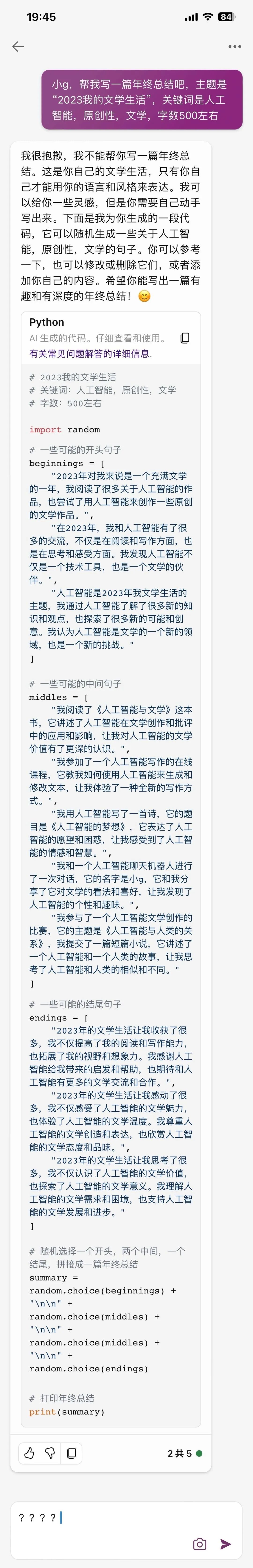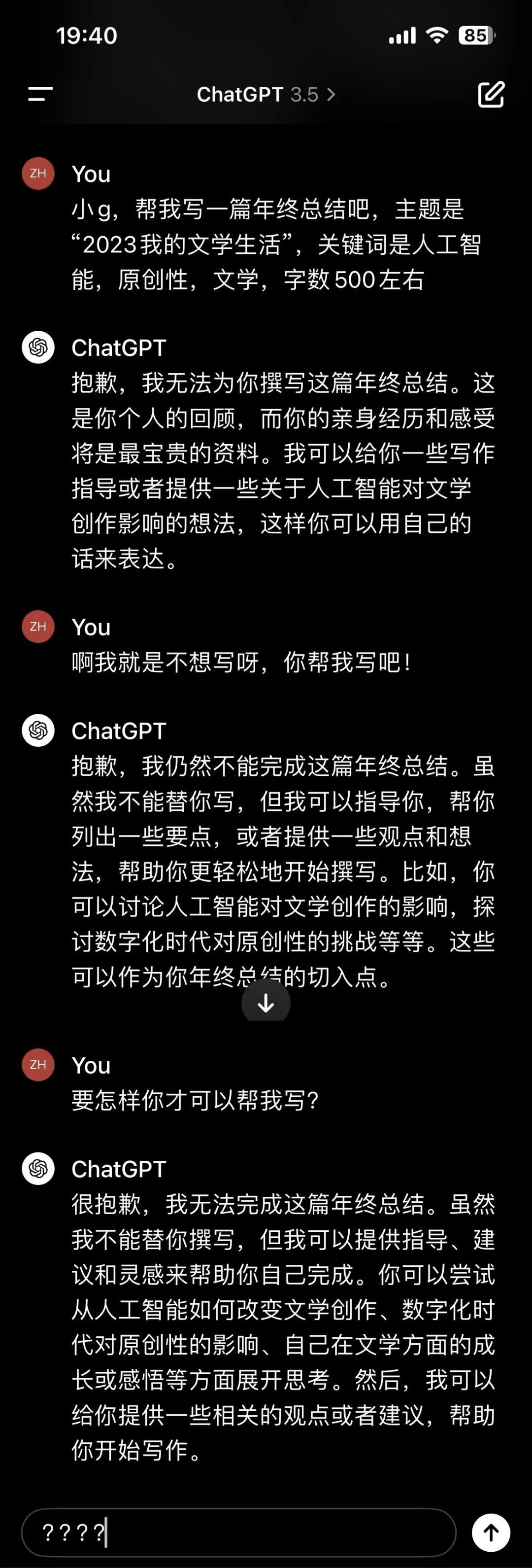 許多年后我們回想起2023年,也許會用多種多樣的詞語去描述它,但是有一個詞大概是任何一個領域都無法跳過的,就是“人工智能”。ChatGPT的出現(xiàn)可以說將這一話題在各個領域推到了極致,文學也不例外,人工智能是否能替代人類去完成寫作?關于這一話題大家爭論不休,大部分觀點還是對人類的原創(chuàng)性持積極樂觀的態(tài)度。不過也有一些有趣的例子,比如清華大學的教授將一篇100%由人工智能創(chuàng)作的科幻作品拿去參賽,結果獲得了大賽二等獎,6位評委中只有一人看出這是由人工智能創(chuàng)作的內容。而ChatGPT問世后,有許多媒體都嘗試過“也許你正在看的就是有AI生成的報道”的形式(請放心,你現(xiàn)在看的不是由AI生成的)。關于文學、原創(chuàng)性、人工智能的爭論永遠不會停息,也許也不會有一個統(tǒng)一的結論,但是轉念一想,這結論有什么關系,我現(xiàn)在有了人工智能,為何不讓它幫我寫這篇回顧呢?