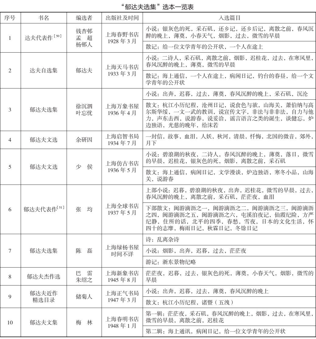 為了真正看清《郁達夫選集》篇目編選的細節(jié),這里把1951年7月前出版的“郁達夫選集”性質(zhì)的十種書籍篇目整理如下: