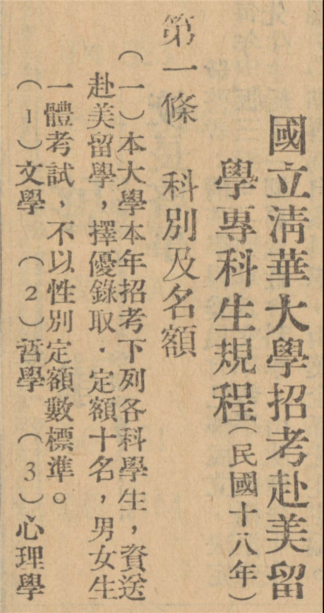 羅家倫履新時(shí),帶來此前在東南大學(xué)的門生郭廷以做秘書,請來北大校友楊振聲擔(dān)任教務(wù)長,馮友蘭任秘書長。一九二九年一月,羅家倫任命楊振聲、馮友蘭和各系主任組成招考委員會(huì),商討本年留美??瓶荚嚪桨浮?嘉瘯?huì)決定設(shè)文學(xué)、哲學(xué)、心理、數(shù)學(xué)、物理、化學(xué)、生物、歷史、地理、政治、經(jīng)濟(jì)、社會(huì)人類學(xué)、市政工程十三科,定額十名,男女均可報(bào)考,錄取不分性別,七月一日起在北平、上海同時(shí)考試。當(dāng)時(shí)清華共十四系,除中文系外與考試的十三科一一對應(yīng),表明方案的設(shè)計(jì)是從照顧本??忌霭l(fā)。四月初,清華董事會(huì)開第二次常會(huì),再度核減年度預(yù)算,又議決增加留美名額,自當(dāng)年起每年考選??粕?,其中女生至少取五名??荚囉啥聲?huì)主持辦理,楊杏佛、凌冰、胡彬夏、張歆海和羅家倫為籌備委員,聘請國立大學(xué)教授組織招考委員會(huì)。此次會(huì)前,任鴻雋辭去常務(wù)董事,改選胡彬夏繼任。胡彬夏是清末第一批公派留美女生,回國后投身教育事業(yè),致力于為女性爭取平等權(quán)利,也是清華董事會(huì)首位女性,保障女生名額應(yīng)由她力主通過。另兩位提議增加留學(xué)名額的董事凌冰和張歆海均出身清華,張歆海有兩個(gè)弟弟張企恭、張企泰正在清華大學(xué)部就讀。