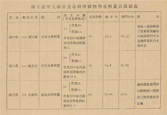 七月一日至八日,留美考試在清華和上海交大舉行,前五天筆試,后三天口試。報(bào)名的一百四十三人棄考、輟考者不少,最終一百零四人完成考試。七月二十五日,考委會(huì)議定正取十人,備取三人。正取名單中,文學(xué)楊業(yè)治、哲學(xué)沈有鼎、政治王贛愚、物理周同慶、化學(xué)袁翰青均系清華應(yīng)屆畢業(yè)生,歷史郭斌佳和數(shù)學(xué)胡坤升為清華助教,只有心理馮德培、經(jīng)濟(jì)梁慶椿、生物張宗漢三人來自外校。招考章程原為擇優(yōu)錄取,即錄取成績最佳的十人,各門名額不限,每科取一人改變了規(guī)則??嘉瘯?huì)還以擴(kuò)大留學(xué)機(jī)會(huì)為由,決定已考取其他留學(xué)考試者不予錄取,這也事先未說明。中央大學(xué)區(qū)當(dāng)年六月下旬舉辦歐美官費(fèi)留學(xué)考試,均為理工科,五名江蘇籍清華學(xué)生同時(shí)報(bào)考中大和本校。七月六日中大留學(xué)考試發(fā)榜,清華物理系施士元和化學(xué)系張大煜中選,二人也因此被排除在清華錄取之外。