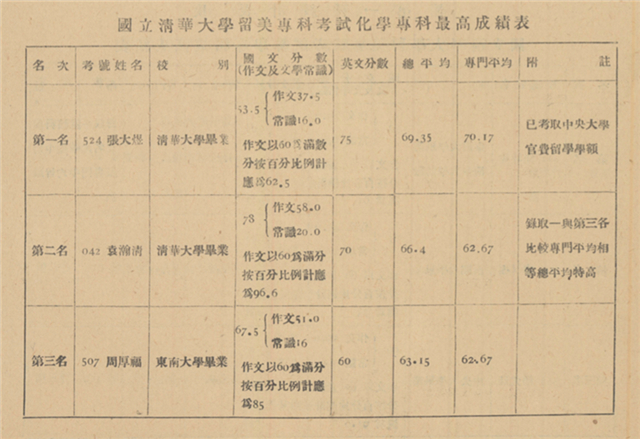 國立清華大學(xué)留美??瓶荚嚮瘜W(xué)??谱罡叱煽儽?/span>