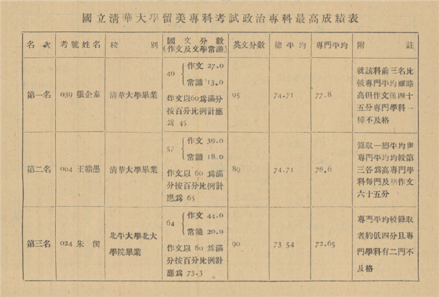 國立清華大學(xué)留美專科考試政治??谱罡叱煽儽?/span>