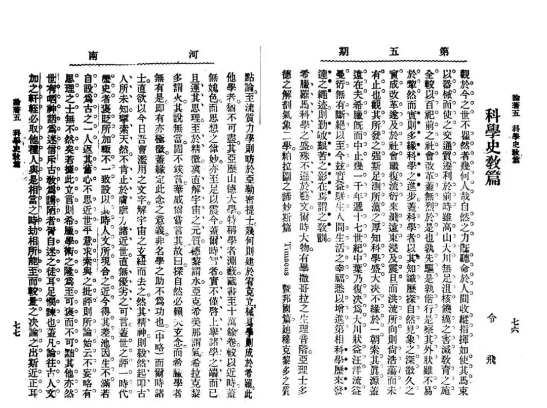 《科學(xué)史教篇》初發(fā)表于一九○八年六月《河南》月刊第五號,署名令飛。