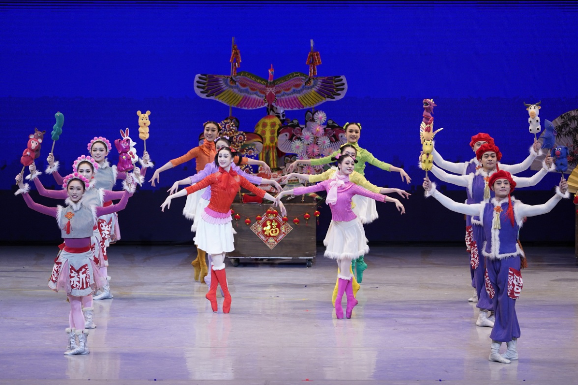舞臺(tái)上,紅彤彤的燈籠、喜慶的春聯(lián)、熱鬧的廟會(huì)奏響了中國(guó)農(nóng)歷新年的序曲;“團(tuán)團(tuán)”和“圓圓”家的年夜飯彰顯了中國(guó)禮儀之邦的待客之道、尊老愛(ài)幼的傳統(tǒng)美德,一張全家福更傳達(dá)了中國(guó)人對(duì)親情的重視和對(duì)團(tuán)圓的向往;“胡桃?jiàn)A子”大戰(zhàn)“年”獸,則充滿童趣地演繹了“過(guò)年”的傳說(shuō);而當(dāng)寓意吉祥的仙鶴在蒼勁的松樹(shù)下迎著朝陽(yáng)翩翩起舞——一幅“松鶴延年”的祥瑞畫卷中,西方芭蕾藝術(shù)在中國(guó)文化意象中煥發(fā)出了美妙的東方神韻;扇子舞、絲綢舞、糖葫蘆舞、風(fēng)箏舞、陀螺舞、金元寶舞、瓷器舞,一派頗具中國(guó)元素的慶典場(chǎng)面讓阿聯(lián)酋觀眾游歷在瑰麗多姿的中國(guó)傳統(tǒng)文化藝術(shù)長(zhǎng)廊中,在歡樂(lè)祥和、喜慶溫馨的氣氛中與“團(tuán)團(tuán)”“圓圓”一家共同迎接中國(guó)農(nóng)歷新年的到來(lái)……
