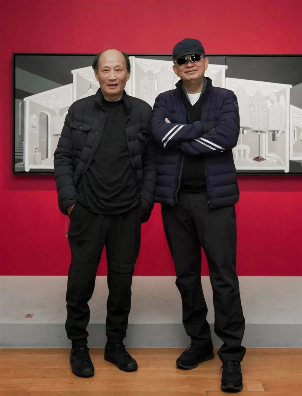 作家金宇澄、導(dǎo)演王家衛(wèi)在繪畫展現(xiàn)場。本文展覽圖片均來自“東一美術(shù)館”微信公眾號。