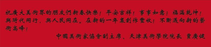 18、中國美術家協(xié)會副主席、天津美術學院院長 賈廣?。鹤V大美術界的朋友們新春快樂!平安吉祥!事事如意!福滿乾坤!與時代同行,與人民同在。在新的一年里創(chuàng)作豐收!不斷邁向新的藝術高峰!