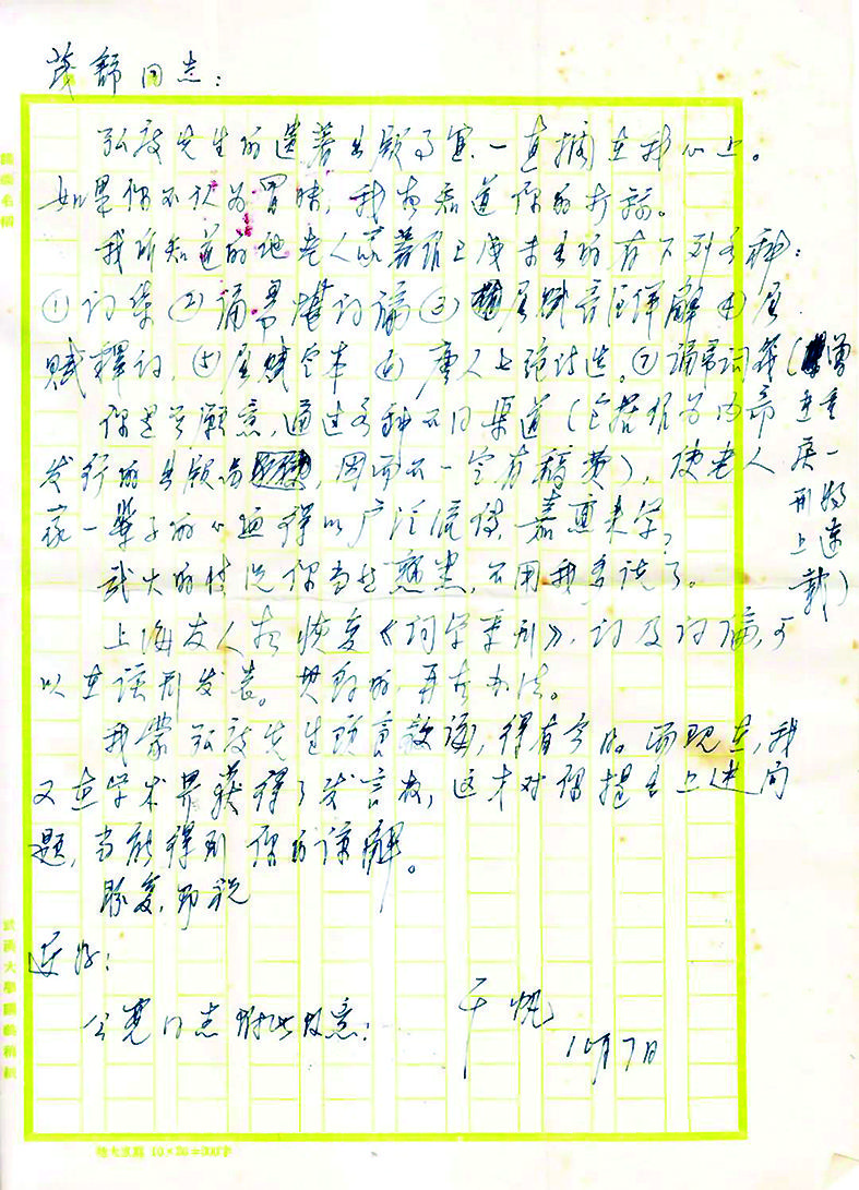 當(dāng)時(shí),程先生還提出了一系列重要的學(xué)術(shù)理念,其中一條就是要注重海外漢學(xué)的成果。他認(rèn)為,研究中國(guó)的學(xué)問,應(yīng)該具有全球的視野,不能忽視海外同行的著述。這些,在他的書簡(jiǎn)中也能體現(xiàn)出來。早在1979年10月12日,他就致信葉嘉瑩先生:“自四兇亂政,艾歷歲年,文化交流瀕于斷絕,比方擬與海外學(xué)術(shù)機(jī)構(gòu)及學(xué)人加強(qiáng)聯(lián)系,想先生久居西海,于情況或較熟悉?!碑?dāng)天,他也寫信給周策縱先生,表達(dá)了大致相同的意思。至于想要了解的,也有明確的指向,或曰“研究方法不同于國(guó)內(nèi)傳統(tǒng)而見解精辟者”(1980年6月30日致葉嘉瑩信),或曰“方法新穎、議論精辟、足供諸生學(xué)習(xí)者”(1981年1月19日致周策縱信)。而對(duì)于學(xué)生來說,要想具有全球化的視野,就不能不學(xué)好外語。程先生對(duì)外文的重視,在當(dāng)時(shí)治國(guó)學(xué)的老一輩學(xué)者中是非常突出的。1983年程先生的碩士生張三夕被錄取為張舜徽先生的博士生,他在欣慰之余,3月9日給三夕兄寫信:“你一定要認(rèn)真處理好幾個(gè)關(guān)系:品德和學(xué)術(shù)、考據(jù)和詞章、文學(xué)和史學(xué)、中文和外文、理論和材料。這幾方面要一起抓,不可有所偏廢。特別是外語,不要丟掉?!辈⑻貏e強(qiáng)調(diào):“作為一個(gè)現(xiàn)代的博士,英語不能達(dá)到四會(huì)是不行的,這你在將來的工作中必然會(huì)感到。”我和曹虹、張伯偉、程章燦一起讀博士的時(shí)候,學(xué)校開設(shè)的英文課結(jié)束后,程先生還曾聘請(qǐng)老資格的外交官尹祿光先生專門為我們4人開設(shè)英文小班。