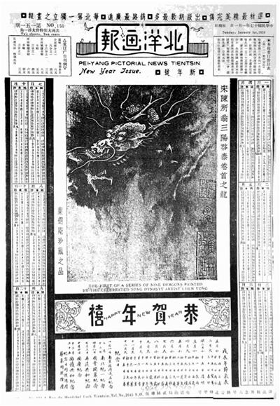 且看開辦還不到兩年的、當(dāng)時號稱“北方巨擘”、“中國唯一的大畫報”的《北洋畫報》,即刻推出了以龍為主題的“新年號”(總第151期)。這一期畫報封面以宋代著名畫家、畫龍名家陳所翁《三陽啟泰》卷首所繪之龍為主圖,這威風(fēng)凜凜、氣勢雄渾的視覺感受,為讀者帶來了一份新年新氣象。