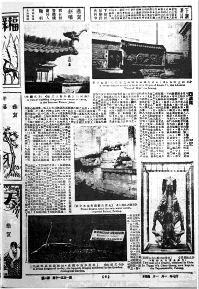 翻到第三版,又是六幅與龍有關(guān)的“國寶”建筑文物圖片,密布于版面之上,看來這就是要讀者在“龍年”里集齊“龍卡”的意思了。這些“龍卡”所在地,還有“北京天安門前石刻蟠龍華表”“北京中央觀象臺天文儀品之座”“御碑趺上之龍形”“北京頤和園之陳設(shè)品”“北京國子監(jiān)大成殿石階”,以及“曲阜孔廟廊前蟠龍石柱”等等。