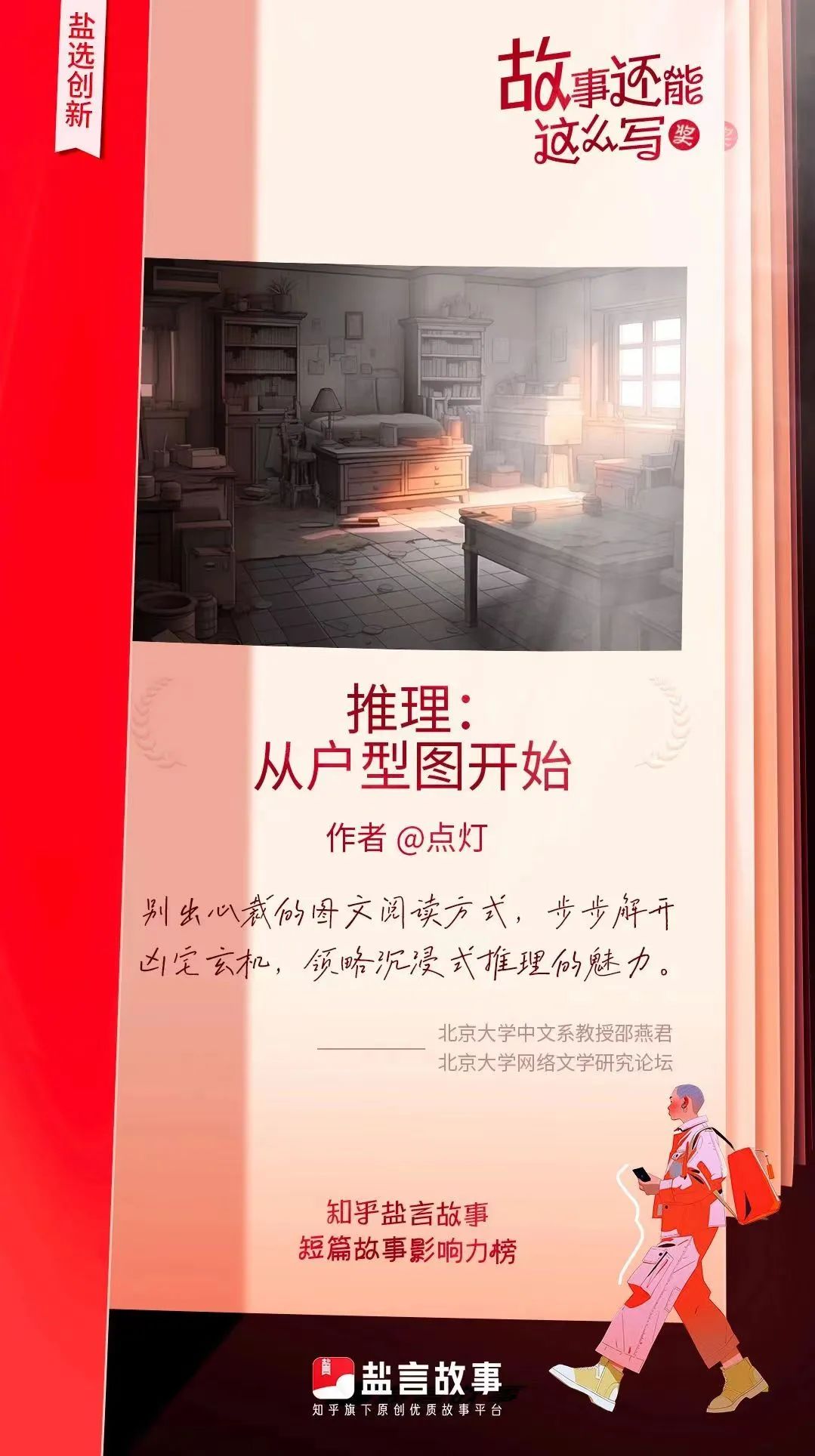 點(diǎn)燈,1999年生。知乎鹽言故事簽約作家。擅長短篇懸疑小說創(chuàng)作,代表作《最后的真相》《活在真空里》《兄友弟恭:沉沒的人生》《逼上梁山》《黑樓往事》(“黑樓系列”)《推理:從戶型圖開始》《私了》等,在知乎獲得上億閱讀量,三部作品位列知乎懸疑榜單前十。“黑樓系列”小說出版已簽約,《活在真空里》《兄友弟恭》《逼上梁山》《黑樓往事》影視改編權(quán)已售出。