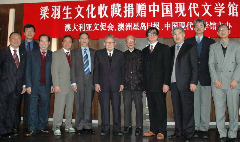 2004年7月,中國現(xiàn)代文學(xué)館老朋友陳丹晨先生告知時任文學(xué)館館長陳建功、常務(wù)副館長李榮勝,定居澳大利亞的武俠小說大師梁羽生先生已八十高齡,重病在身,他有意將其一生創(chuàng)作的書籍、手稿等文獻(xiàn)資料捐回國內(nèi)。陳丹晨先生與梁羽生相識20多年,是無話不談的好友。陳先生建議文學(xué)館應(yīng)該積極爭取。文學(xué)館領(lǐng)導(dǎo)得知此事后,馬上向中國作協(xié)匯報。很快,當(dāng)年11月間,幾位同志就前往香港與梁先生面談,當(dāng)面表達(dá)中國現(xiàn)代文學(xué)館希望收藏其文學(xué)資料的意愿,并送上中國作協(xié)對梁先生的美好祝愿及真摯問候。