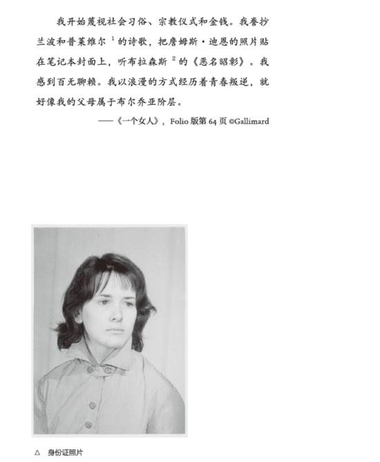 她是學校里的優(yōu)等生,她最喜歡上語文課,她要用一種近乎外語的法語來寫作,因為她日常生活中的法語充滿了俗語和方言,并非是那個用詞嚴謹、語法規(guī)范的法語。她如饑似渴地閱讀書籍,《魔鬼附身》這樣的書名聽著就大逆不道,薩岡的青春小說幫助她想象那個小資的美好世界,就像她后來在小說中寫道:“我以浪漫的方式經(jīng)歷著青春叛逆,就好像我的父母屬于布爾喬亞階層?!?/p>