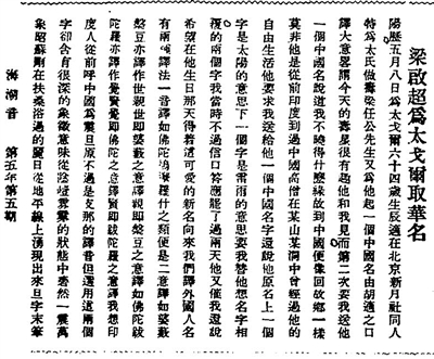 循著這一“深究”之后的思路,翻檢已知現(xiàn)存相關文獻,一時還難以確證。幸運的是,筆者新近發(fā)現(xiàn)在佛教雜志《海潮音》雜志第五年第五期(1924年6月21日印行)之上,有一篇報道名為《梁啟超為太戈爾取華名》,頗為詳實地記述了梁啟超為泰戈爾取中文名這一事跡的歷史細節(jié),且還因之牽扯出關涉梁啟超與胡適的各自“異(佚)文”一篇,自然是頗具歷史意義與研究價值的寶貴文獻。