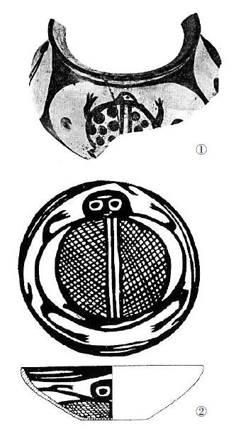 圖二:仰韶文化和馬家窯文化中的蛙紋(①河南陜縣廟底溝遺址出土 ②甘肅師趙村遺址出土) 作者提供