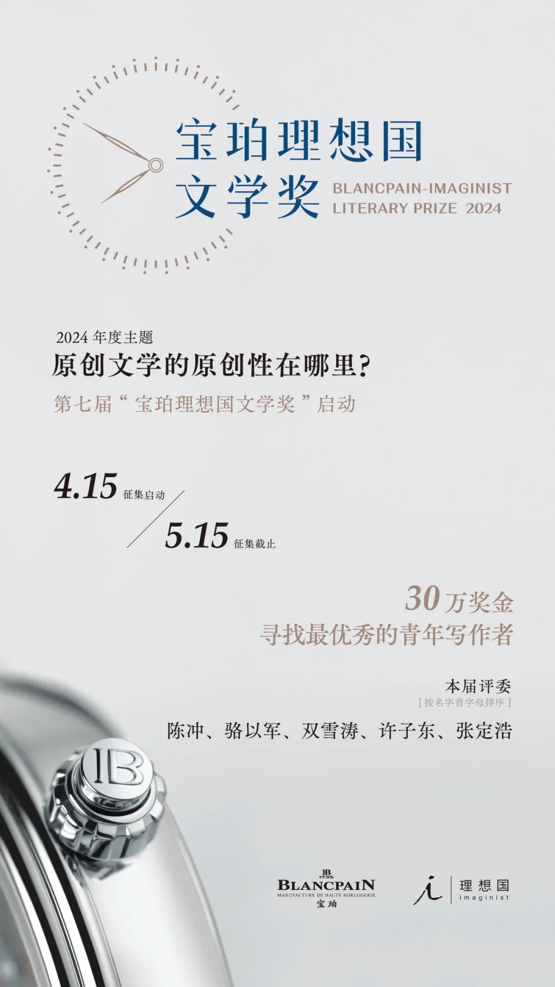 寶珀理想國(guó)文學(xué)獎(jiǎng)以“公正、權(quán)威、專業(yè)”為原則,旨在為華語(yǔ)文學(xué)領(lǐng)域鼓勵(lì)與發(fā)掘45歲以下優(yōu)秀青年作家。共同發(fā)起方——寶珀與理想國(guó),也同時(shí)在向大眾持續(xù)傳遞一則簡(jiǎn)單而意味深長(zhǎng)的信息,“讀書,讓時(shí)間更有價(jià)值”。