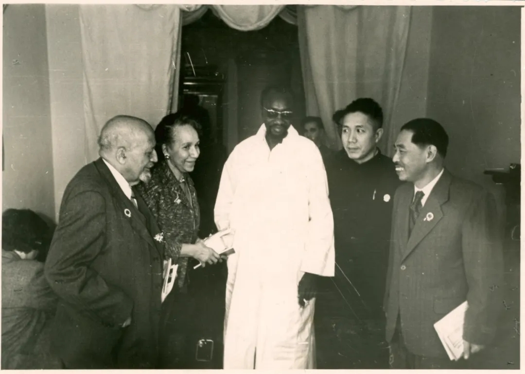 圖2 周揚(yáng)、茅盾與美國(guó)作家W·E·B·杜波依斯、雪莉·格雷厄姆·杜波依斯、塞爾加爾作家,政治家馬杰蒙·迪奧普在亞非作家會(huì)議上。來(lái)源:馬薩諸塞大學(xué)阿默斯特分校圖書館特藏和大學(xué)檔案館,網(wǎng)址:https://credo.library.umass.edu/