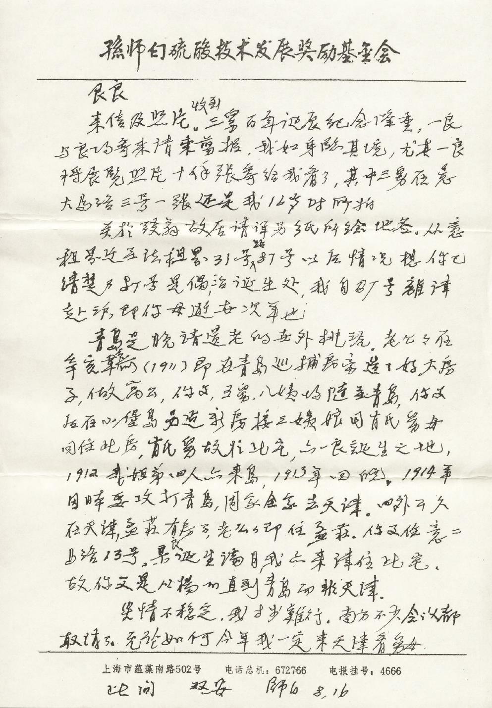 1991年夏,師白表伯曾在來(lái)信中說(shuō),他原計(jì)劃要偕妻女北上看望舅母,并參加弢翁百年誕辰的紀(jì)念活動(dòng),還要和同窗摯友吳大任教授(著名數(shù)學(xué)家)同返南開中學(xué)。然而,由于“必須參加”一年一度的全國(guó)硫酸技術(shù)交流會(huì)而不得不作罷。