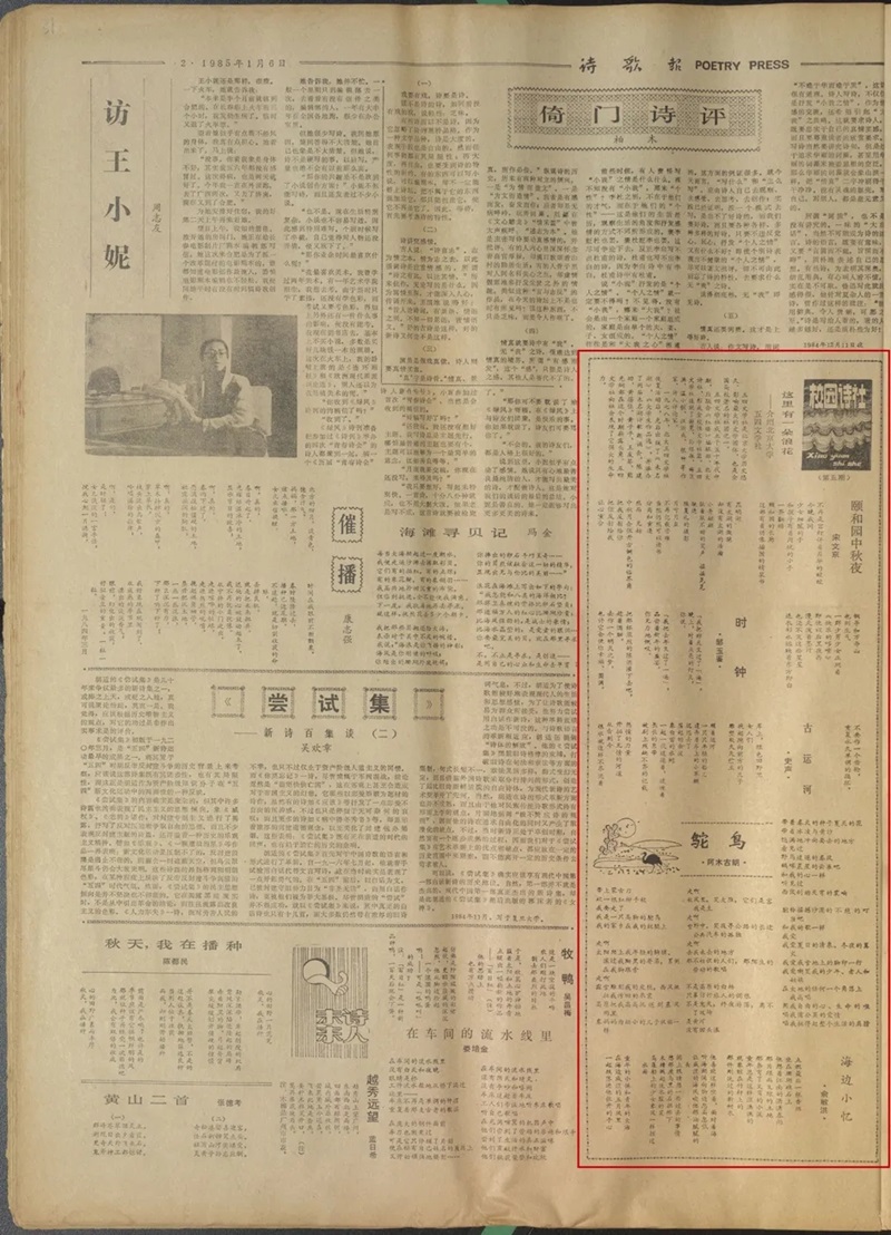 編者按:《詩(shī)歌月刊》編輯整理創(chuàng)刊40周年資料時(shí),在1985年1月6日的《詩(shī)歌報(bào)》(刊物前身)上,看到署名“俞敏洪”的一首詩(shī)作《海邊小憶》,不禁疑惑地問(wèn):這位是否就是新東方的俞老師呢?仔細(xì)一研讀,發(fā)現(xiàn)這一期“校園詩(shī)社”欄目介紹的正是北京大學(xué)五四文學(xué)社。時(shí)間也能對(duì)得上。確定是俞敏洪沒(méi)錯(cuò)了!