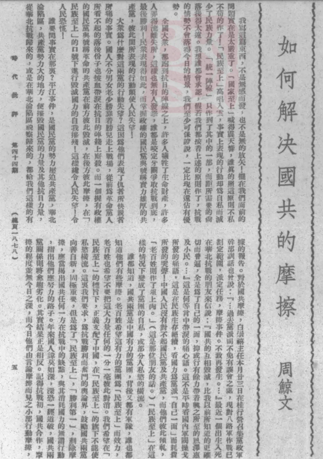 周鯨文《如何解決國(guó)共的摩擦》,《時(shí)代批評(píng)》1940年第2卷第44期