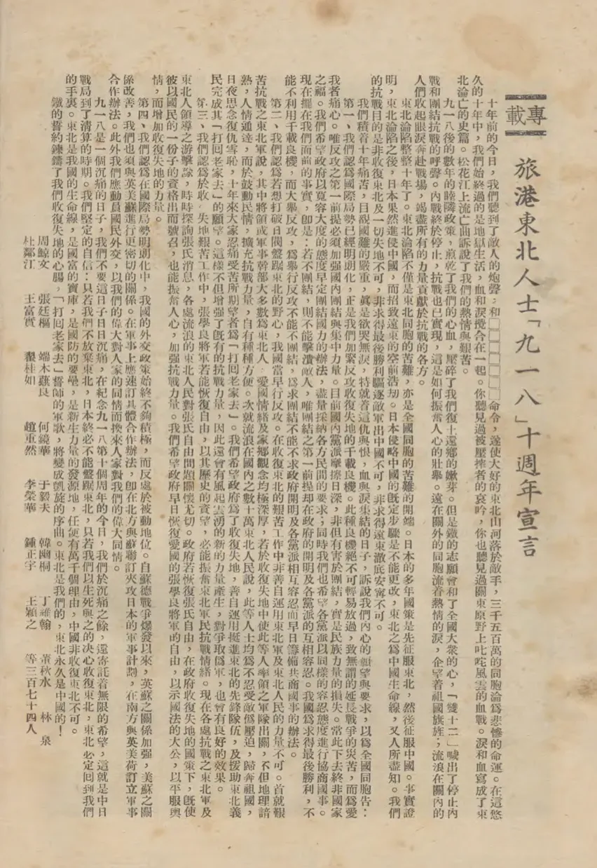 端木蕻良等《旅港東北人士“九一八”十周年宣言》,《時(shí)代批評(píng)》1941年第4卷第79期