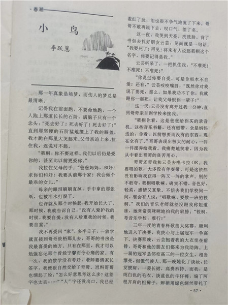 李躍慧的第一篇小說發(fā)表在《金沙江文藝》上,那時(shí)候她讀高一,喜歡聽歌,同學(xué)之間互贈的禮物常常是手抄歌詞,有耐心的連歌譜都抄上。她聽了趙傳唱的《我是一只小小鳥》,高亢嘹亮的歌聲傳遞出小小生命的無奈與倔強(qiáng),深受感染,以此為題寫了一個(gè)小女孩的成長故事。稿子是語文老師幫她投的,小說發(fā)表后,語文老師把她和她的朋友叫到辦公室,一句一句給她們念編輯老師寫來的信。