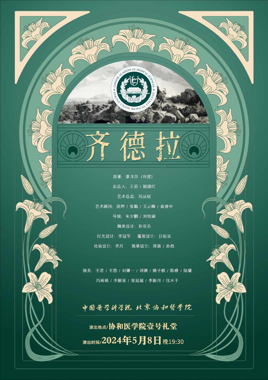 5月8日,由北京協(xié)和醫(yī)學(xué)院、北京人民藝術(shù)劇院共同創(chuàng)排的泰戈?duì)柺闱樵?shī)劇《齊德拉》在北京協(xié)和醫(yī)學(xué)院壹號(hào)禮堂上演。《齊德拉》是泰戈?duì)栍?891年借用史詩(shī)《摩訶婆羅多》素材改編的詩(shī)劇,講述了曼尼普爾國(guó)公主齊德拉在春神與愛(ài)神的賜佑下獲得為期一年的絕世美貌,贏得了英雄阿順那的愛(ài)。此后她卻陷入虛假身份與真實(shí)自我的矛盾抉擇,靈魂備受拷問(wèn)。劇終,她揭開(kāi)面紗,向愛(ài)人顯露本貌并坦陳真相,阿順那深情接受了真實(shí)的她。1924年,泰戈?duì)栐L華期間,為慶祝其64歲生日,由徐志摩、林徽因等新月社成員在協(xié)和禮堂主演了此劇,這也是《齊德拉》英文版首次在中國(guó)演出。100年后的今天,由北京人民藝術(shù)劇院院長(zhǎng)馮遠(yuǎn)征擔(dān)任藝術(shù)總監(jiān),朱少鵬、劉牧涵導(dǎo)演,北京協(xié)和醫(yī)學(xué)院學(xué)生再次演出這部經(jīng)典劇目,具有重要意義。