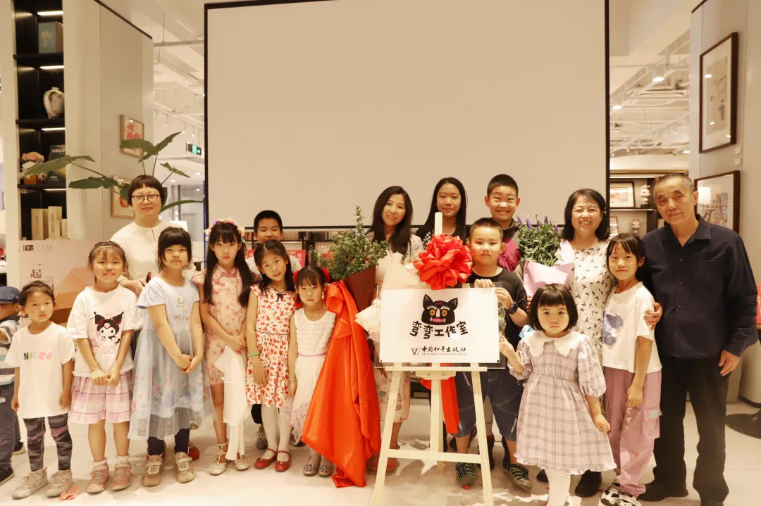 最后,北京航空航天大學(xué)新媒體藝術(shù)與設(shè)計學(xué)院教授顏新元為作者獻花,并與劉雪純、彎彎以及小朋友們一起為“彎彎工作室”揭幕。