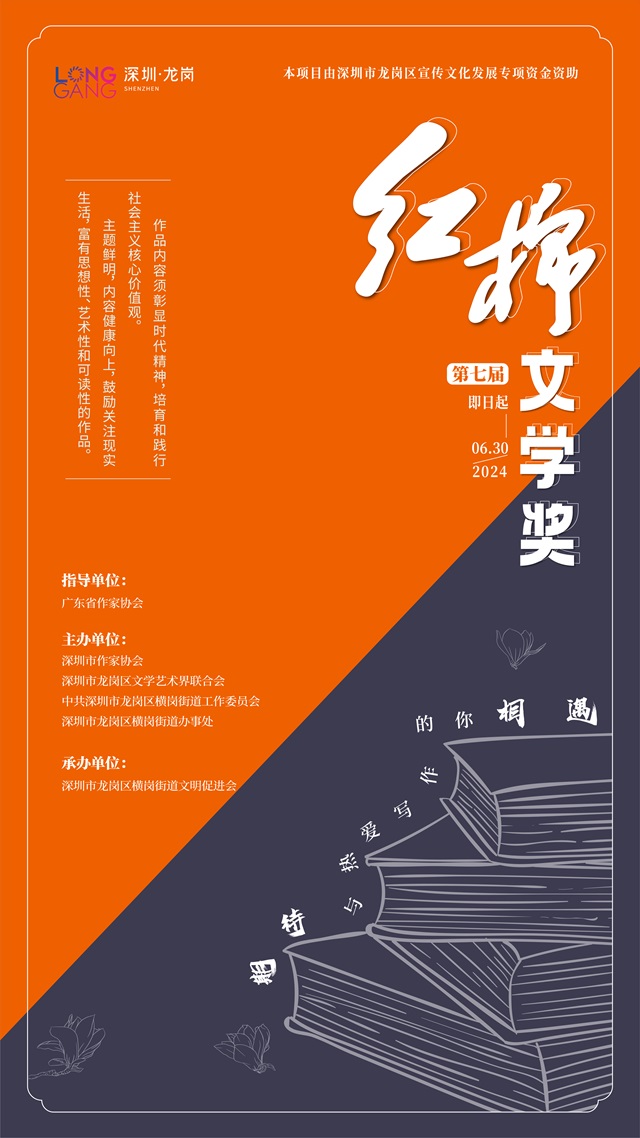 為深入學(xué)習(xí)貫徹習(xí)近平新時(shí)代中國特色社會(huì)主義思想和黨的二十大精神,助推新時(shí)代文學(xué)高質(zhì)量發(fā)展,講好中國故事、傳播好中國聲音,展現(xiàn)可信、可愛、可敬的中國形象。彰顯深圳先行示范作用,弘揚(yáng)社會(huì)主義核心價(jià)值觀,發(fā)現(xiàn)推介當(dāng)代原創(chuàng)文學(xué)精品力作,展現(xiàn)文學(xué)的蓬勃生命力,第七屆 “紅棉文學(xué)獎(jiǎng)”征文活動(dòng)即日啟動(dòng)。