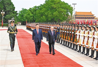 5月16日上午,國(guó)家主席習(xí)近平在北京人民大會(huì)堂同來華進(jìn)行國(guó)事訪問的俄羅斯總統(tǒng)普京舉行會(huì)談。這是會(huì)談前,習(xí)近平在人民大會(huì)堂東門外廣場(chǎng)為普京舉行隆重歡迎儀式。新華社記者 饒愛民攝